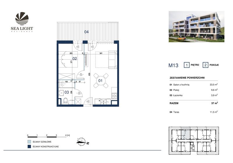 Prezentujemy dwupokojowy apartament o powierzchni 37 mkw z tarasem położony na pierwszym piętrze.