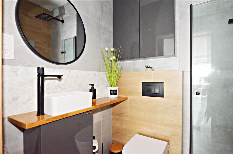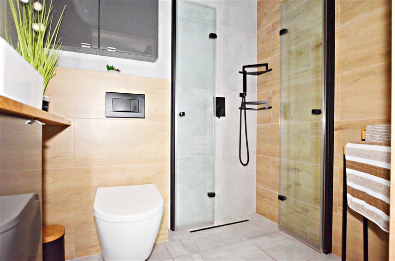 łazienka z wygodną kabiną prysznicową , odpływem liniowym i podwójnymi łamanymi drzwiczkami dla pełnej wygody użytkowania dla każdego,