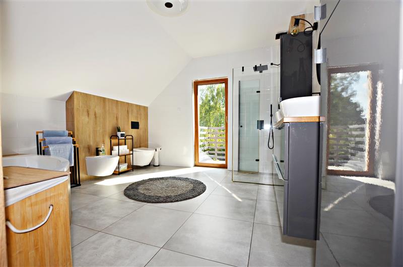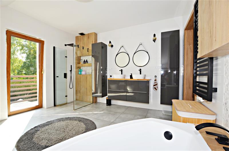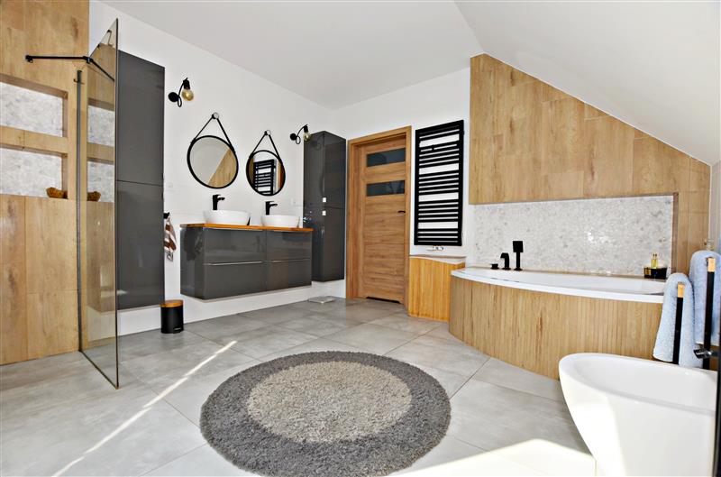 - ponadto na piętrze znajduje się komfortowa rodzinna łazienka z wyjściem na balkon, wyposażona w podwójną toaletką, wannę narożną, kabinę prysznicową, wc i bidet,